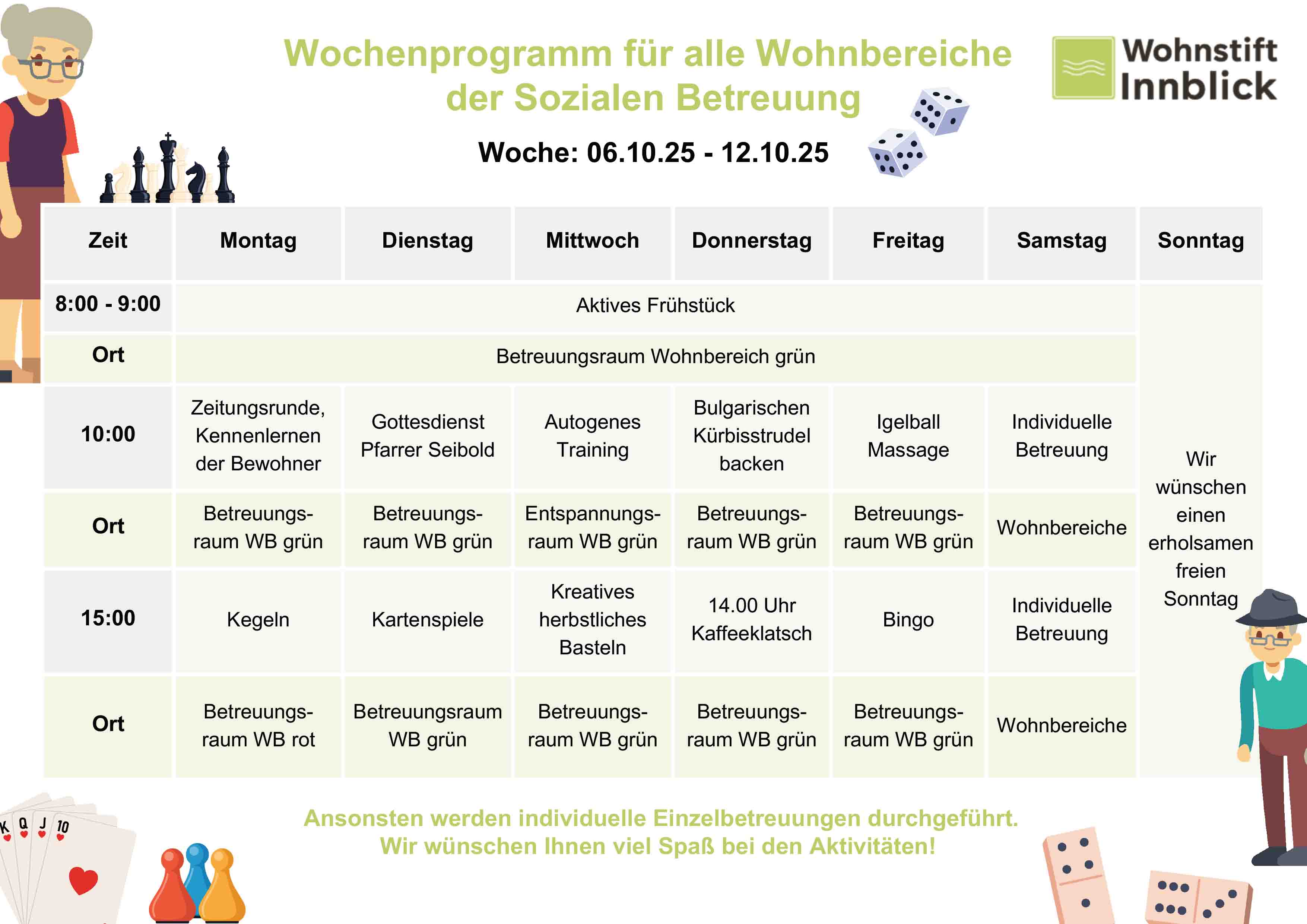 Ein gutes Wochenprogramm hilft den Bewohnern in einem Pflegeheim, sich wohlzufühlen. Es geht nicht nur um Pflege, sondern auch darum, soziale Kontakte zu pflegen, geistig fit zu bleiben und kreativ zu sein. Im Wohnstift Innblick gibt es viele Aktivitäten, die den Alltag bunter machen und die Bewohner dazu ermutigen, aktiv zu bleiben und sich als Teil einer Gemeinschaft zu fühlen.