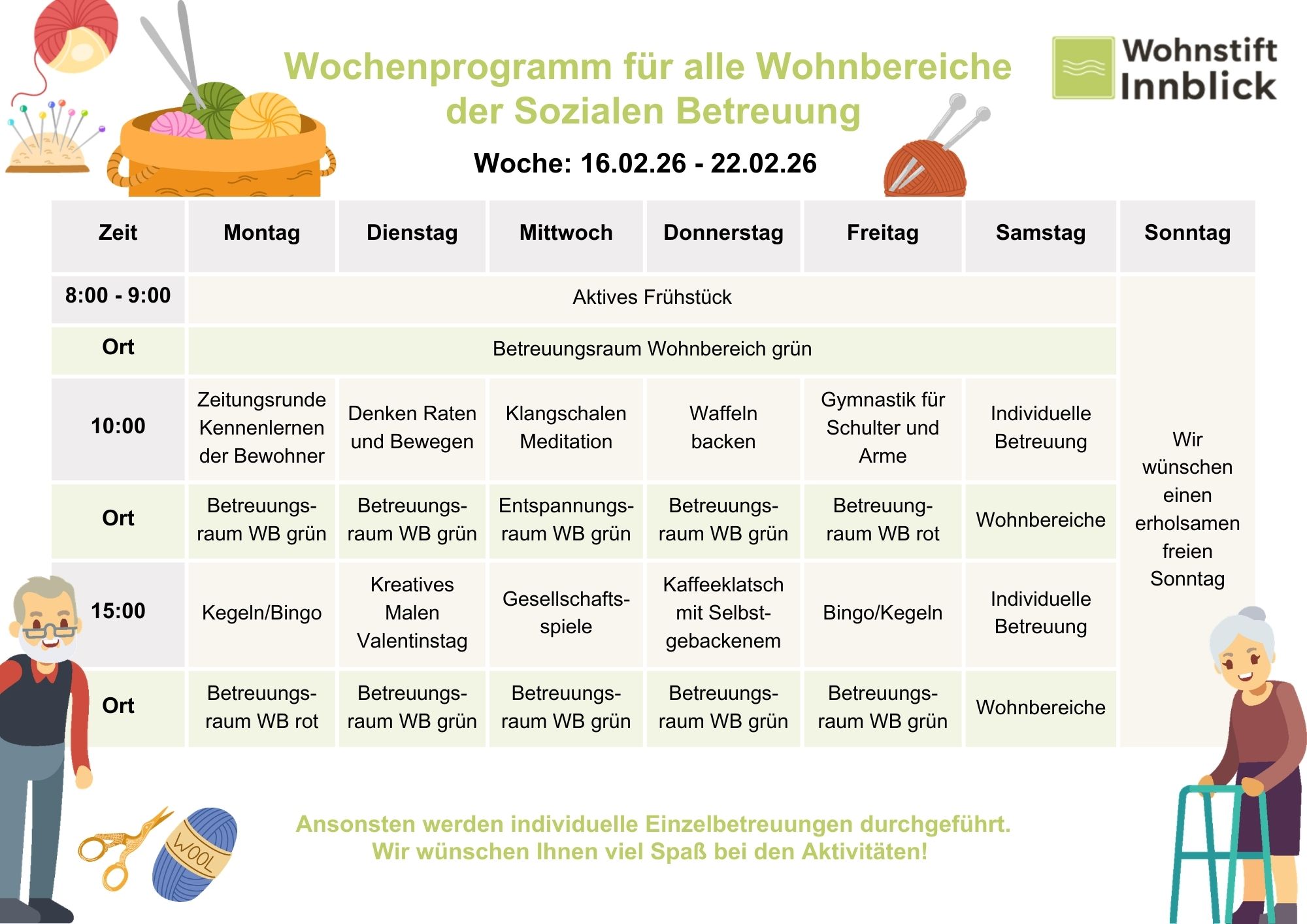 Unsere Bewohner erwartet wieder ein bunter Mix aus kreativen, sportlichen und gemeinschaftlichen Aktivitäten. Hier ein Überblick über die Angebote der Woche: